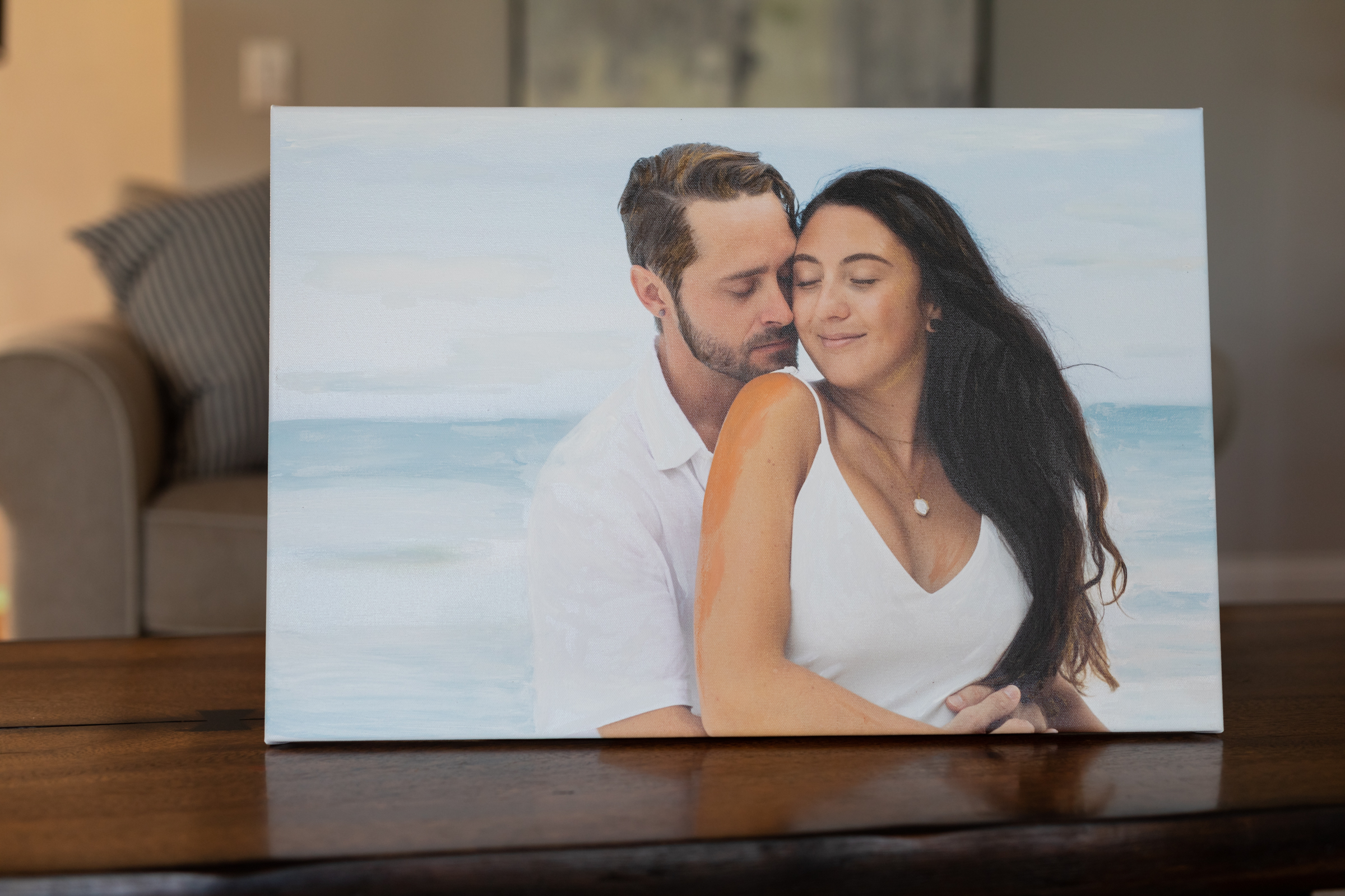 Printing it on canvas first allows it to be crisp (in contrast with someone who is painting from a blank canvas). Then it’s simply highlighted with paint to make something one of a kind. In the wedding photo shown, there were loads of people in the background that my sister painted over to make this more of a statement piece.